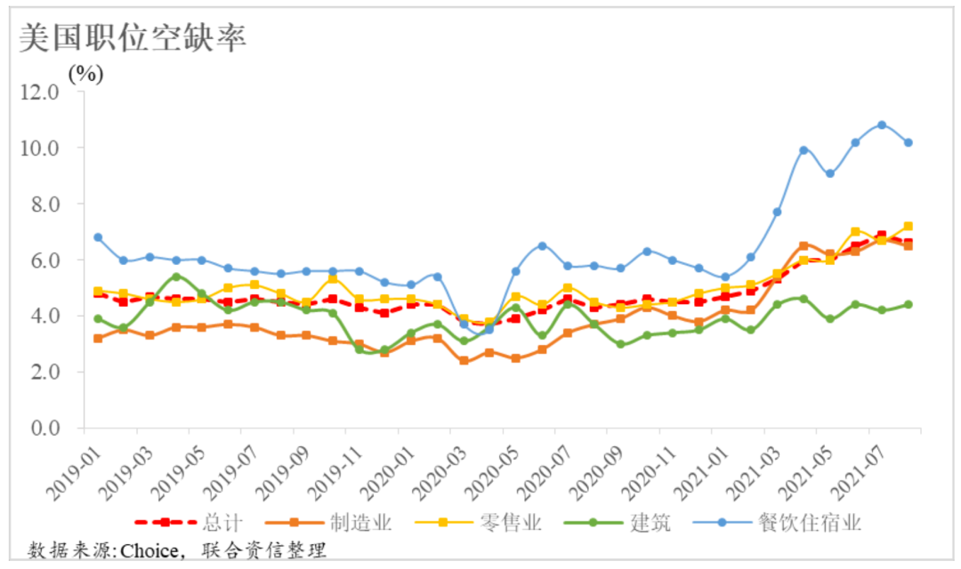 3.勞動(dòng)力供需失衡導(dǎo)致美國(guó)職位空缺率大幅上漲,其中餐飲旅游業(yè)、零售業(yè)等對(duì)社交限制更加敏感的行業(yè)職位空缺率明顯更高。