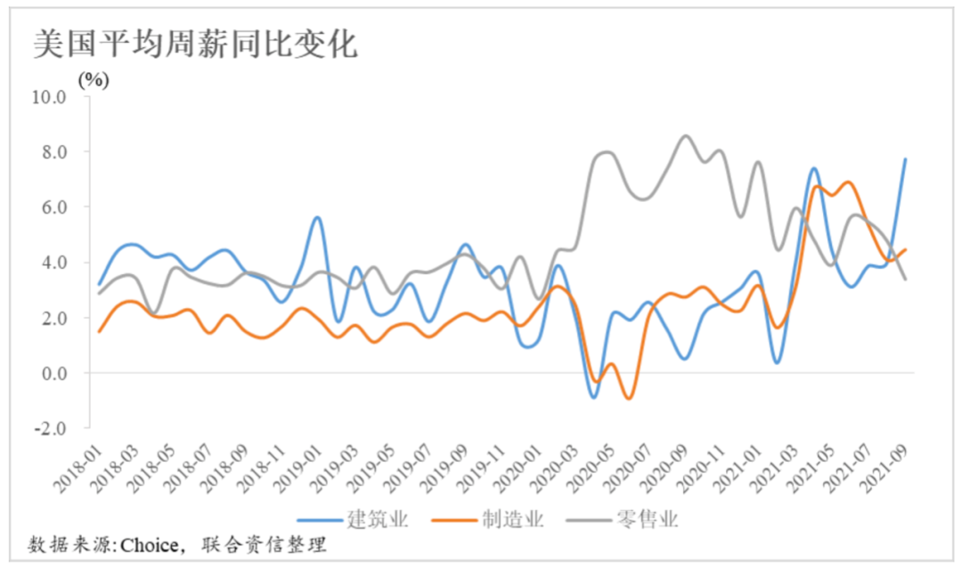 4.勞動(dòng)力短缺導(dǎo)致用工成本大幅增加,行業(yè)平均周薪自2020年中起持續(xù)走高,進(jìn)一步推升企業(yè)生產(chǎn)成本,并導(dǎo)致部分企業(yè)將成本向消費(fèi)者轉(zhuǎn)移。