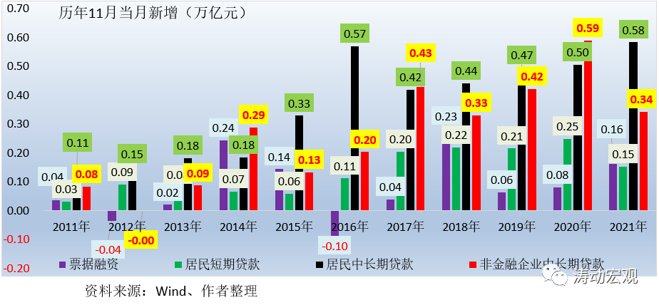 1、受限電限產(chǎn)、疫情多點(diǎn)擴(kuò)散等因素影響,企業(yè)中長期貸款需求仍然延續(xù)10月的弱勢,同比明顯少增。今年11月,企業(yè)中長期貸款新增0.34萬億,同比大幅少增0.25萬億(10月同比少增0.19萬億元),表明實(shí)體經(jīng)濟(jì)融資需求不足,資產(chǎn)荒問題較為突出。實(shí)際上,今年7-11月,企業(yè)中長期貸款同比均明顯少增(合計(jì)少增1.12萬億元)。