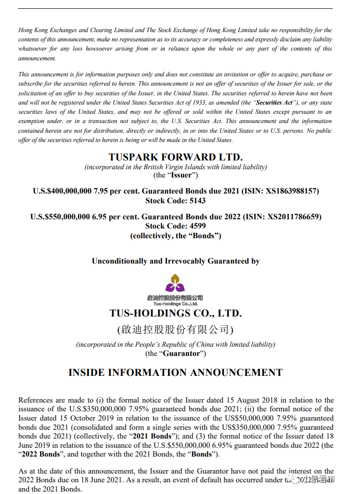 7月8日,啟迪控股股份有限公司(以下簡稱“啟迪控股”)公告稱,由于發(fā)行人及擔保人截至公告日尚未支付于2021年6月18日到期的THSCPA 6.95 06/18/22債券利息,其2022年和2021年美元債發(fā)生違約事件。