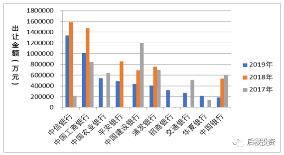 經(jīng)過數(shù)據(jù)整理,我們發(fā)現(xiàn)共有53家銀行的交易記錄,其中出讓金額最大的是中信銀行,達(dá)到134.1億元。五大國有銀行均位列上表所示前十大銀行,前十大銀行全年累計(jì)出讓資產(chǎn)金額約521億元,所占比重接近八成。另外,圖二我們也能更直觀感受銀行三年變化,比如中信銀行和工商銀行出讓金額這兩年保持前二;建設(shè)銀行、中國銀行等出讓金額逐年減少;