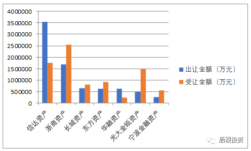 圖中數(shù)據(jù)為持牌AMC在整個(gè)不良市場所有收包、出包金額統(tǒng)計(jì)。從對比數(shù)據(jù)上看,僅信達(dá)資產(chǎn)和華融資產(chǎn)出讓金額>受讓金額;長城資產(chǎn)收、出包金額相對平衡。