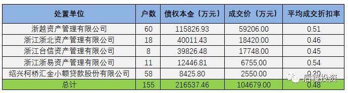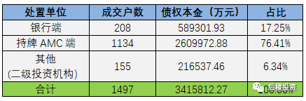 從阿里拍賣平臺中篩選出浙江地區(qū)債權(quán)(超過1000萬)成交記錄,總成交戶數(shù)1497戶,成交債權(quán)總本金341.6億,總成交價(jià)157.8億元,其中持牌AMC出讓比重接近80%。