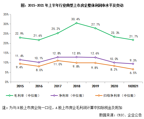 2021年上半年,行業營收增速較去年疫情影響下的低位有所回升,但利潤增速明顯低于營收增速且處在歷年來的較低水平。這主要是因為前期高地價項目和資本化利息步入結算,推高營業成本、企業整體利潤空間繼續承壓。上半年,行業整體的利潤率指標已降至2015年以來的歷史最低水平,近半數典型房企毛利率、歸母凈利率雙降。