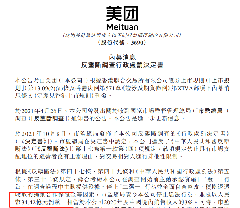 10月8日,國家市場監管總局根據《中華人民共和國反壟斷法》第四十七條、第四十九條規定,綜合考慮美團違法行為的性質,依法作出行政處罰決定,責令美團停止違法行為,并處以其2020年中國境內銷售額3%的罰款,計34.42億元。