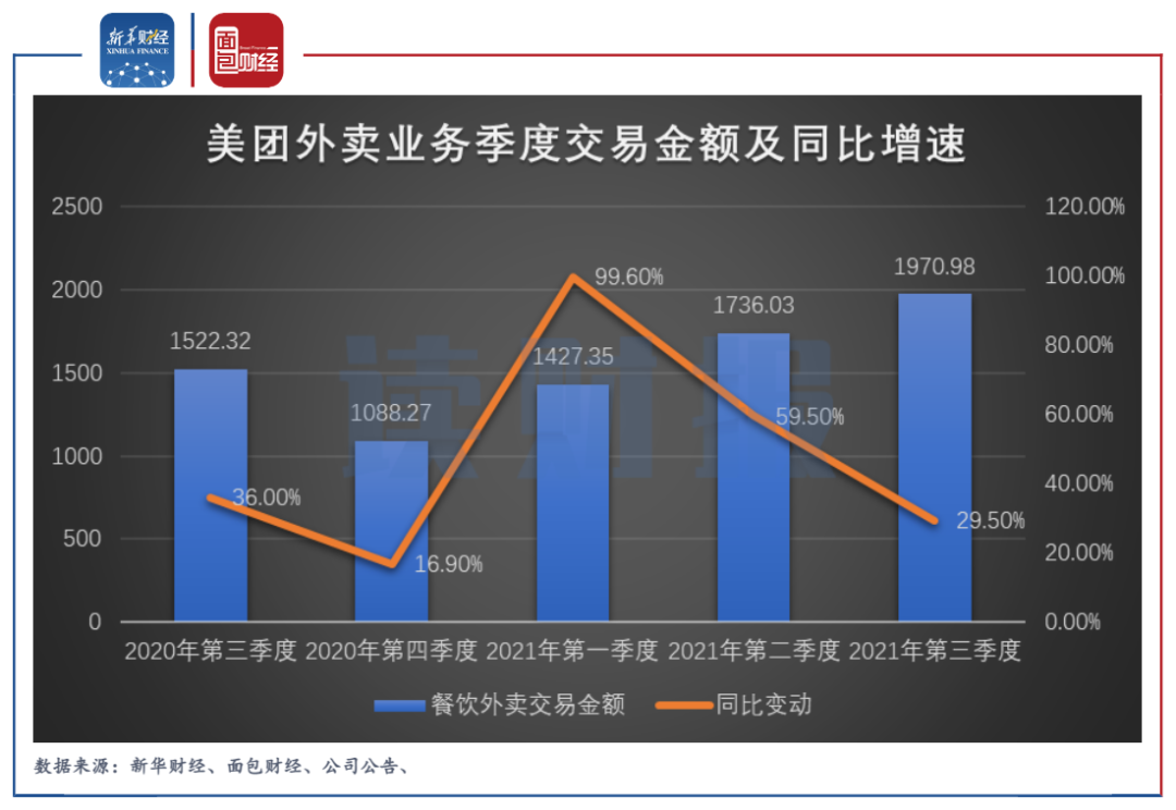 圖2:2020Q3-2021Q3美團外賣業務季度交易金額及其同比
