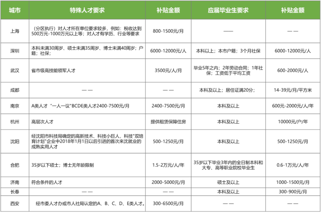 但整體而言,大部分城市對特殊人才的租房補貼力度都要明顯高于對應屆畢業(yè)生的補貼,一方面,高精尖和特殊人才的價值更大,可以較大程度的幫助城市的產(chǎn)業(yè)升級和經(jīng)濟發(fā)展;另一方面,由于大量的高精尖人才引進時會攜帶家庭成員,因此也相對需要更多的補貼來解決安居問題。