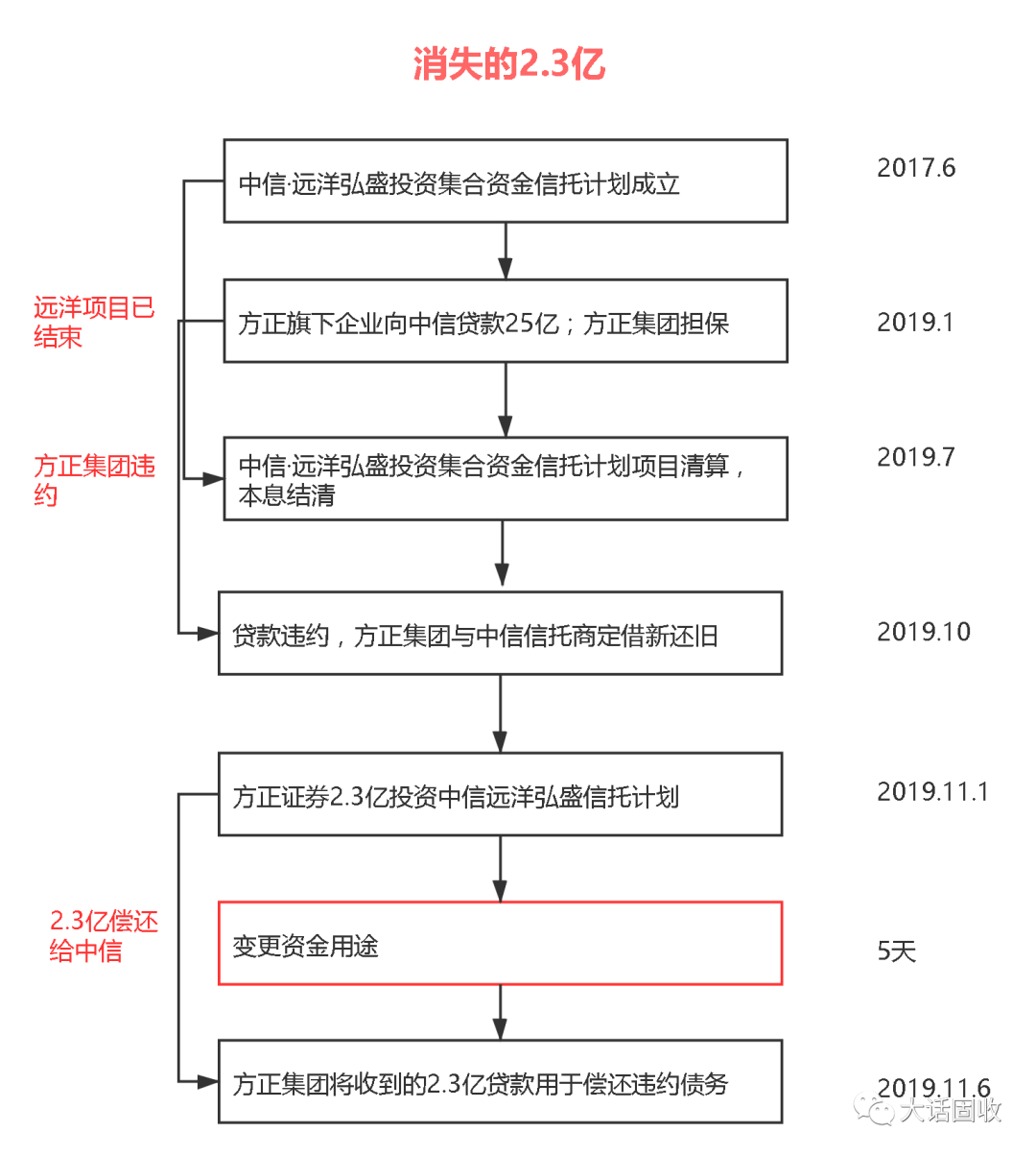 這樣來看,時間線就更有意思了,方正集團(tuán)的貸款和遠(yuǎn)洋信托計劃的清算是交叉進(jìn)行的: