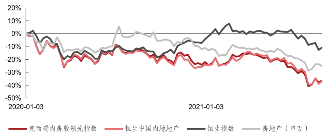具體數據來看,2020年1月1日至今,克而瑞內房股領先指數跌幅36.4%,同期恒生中國內地地產指數跌幅36.9%,恒生指數跌幅10.7%,房地產(申萬)板塊跌幅25.2%。