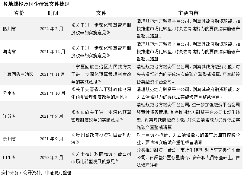 2018年9月,中共中央辦公廳、國務院辦公廳印發(fā)的《關于加強國有企業(yè)資產負債約束的指導意見》提出,對嚴重資不抵債失去清償能力的地方政府融資平臺公司,依法實施破產重整或清算,堅決防止“大而不能倒”,堅決防止風險累積形成系統(tǒng)性風險。2021年4月,國務院公布《關于進一步深化預算管理制度改革的意見》【國發(fā)〔2021〕5號】提出,清理規(guī)范地方融資平臺公司,剝離其政府融資職能,對失去清償能力的要依法實施破產重整或清算,多省份沿用此表述。