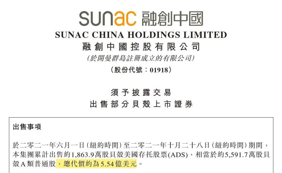 融創的“輸血”動作還不止于此,更早的10月底,融創中國公告披露,于今年6月1日(紐約時間)至10月28日(紐約時間)期間,累計出售約1863.9萬股貝殼美國存托股票(ADS),相當于約5591.7萬股貝殼A類普通股,總代價約為5.54億美元,折合人民幣約為35.4億元。