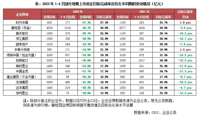 但受一季度以來行業信心不足以及部分城市疫情反復等多方面因素的影響,即使今年以來大部分房企未披露目標,或是已經主動調降了銷售目標。1-4月企業實際的業績完成情況仍不及預期,年內銷售去化壓力放大。二三季度企業需盡可能加緊貨量供應,積極營銷以提高去化率水平,來保證年度業績預期的實現。