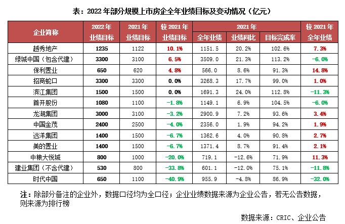 同時,也有多數房企調降業績目標,且降幅較其他企業相對明顯。如中糧大悅城、建業、時代2022年的年度目標較2021年目標的降幅均高于20%。其中,建業和時代2022年的目標較2021年實際完成業績的降幅分別達到了11.8%和32%。值得注意的是,這三家企業2021年的業績目標完成度都較低,中糧大悅城和建業集團的目標完成度不足80%,故今年都相應調低了銷售目標。