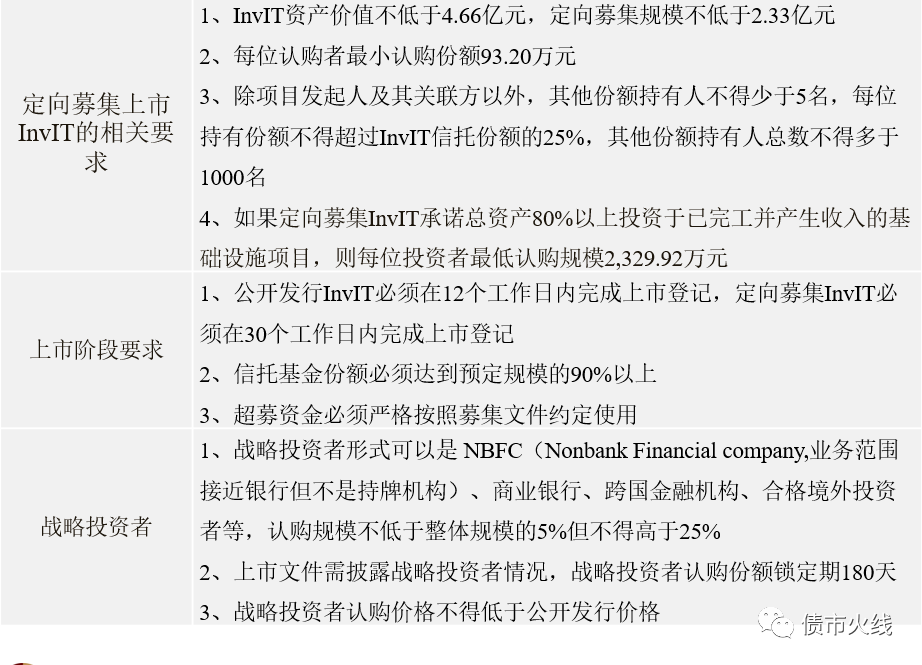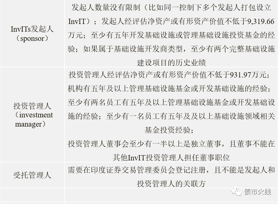 印度證券交易管理委員會(SEBI)于2007年發布REITs監管文件草案,通過與政府部門、地產開發商和投資者的合作磋商并借鑒國外成熟市場的經驗,最終在2014年頒布了目前施行的REITs監管文件,2019年4月India’s maiden REITs的上市讓印度REITs最終破繭而出。在REITs監管文件和產品上市的同時,印度的invITs也是在同步發展,目前已有“Indian Grid Trust”和“IRB INvIT Fund”兩只產品在NSX上市。其實印度REITs和invITs載體均為信托,在產品結構和監管條款上有許多相似之處,以下就是對印度invITs的監管規則進行簡要的概述: