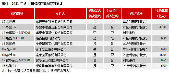 2021年5月,已違約主體泰禾集團股份有限公司(簡稱“泰禾集團”)、華夏幸福基業股份有限公司(簡稱“華夏幸福”)和重慶協信遠創實業有限公司(簡稱“重慶協信”)的存續債券繼續出現違約。截至2021年5月末,華夏幸福尚有存續債券153.30億元,其中有33億元在2021年面臨到期或回售;重慶協信尚有存續債券13.78億元,在7月和9月到期;泰禾集團所有發行債券均已到期或違約。