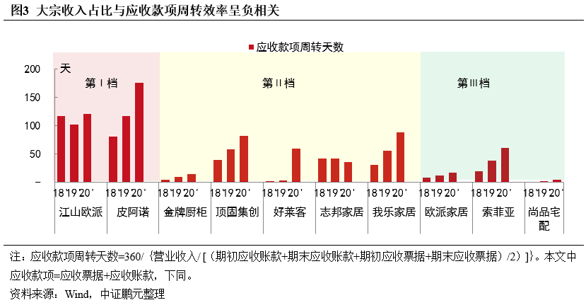 本次房企風險暴露,通過大宗業務傳導,直接影響定制家居企業的收入及回款。大宗業務“量大利薄賬期長”,會拖累企業應收款項周轉效率,導致其經營現金流弱化,甚至引發回款風險,已有江山歐派、皮阿諾、頂固集創、我樂家居等企業被曝持有的恒大商票等款項逾期;大宗業務毛利率本就低于零售渠道且呈下降趨勢,未來如轉向同優質房企合作,預計毛利率仍將承壓。相比之下,龍頭企業受影響較小,中部、尾部企業受波及程度大,大宗業務占比高、合作房企負債率高的企業影響更甚。