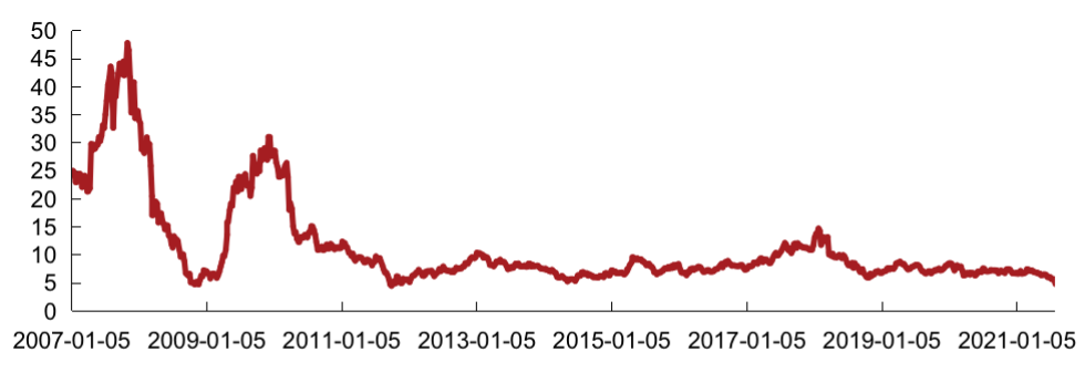 備注:1)恒生中國(guó)內(nèi)地地產(chǎn)指數(shù)的推出主要是為了反映前10只市值最大、流通性最高,在香港上市但主要營(yíng)業(yè)收入來自中國(guó)內(nèi)地的房地產(chǎn)股票表現(xiàn)。當(dāng)前成分股共10只,分別為:中國(guó)金茂、中國(guó)海外發(fā)展、世茂集團(tuán)、龍湖集團(tuán)、華潤(rùn)置地、龍光集團(tuán)、碧桂園、中國(guó)恒大、碧桂園服務(wù)、融創(chuàng)中國(guó)