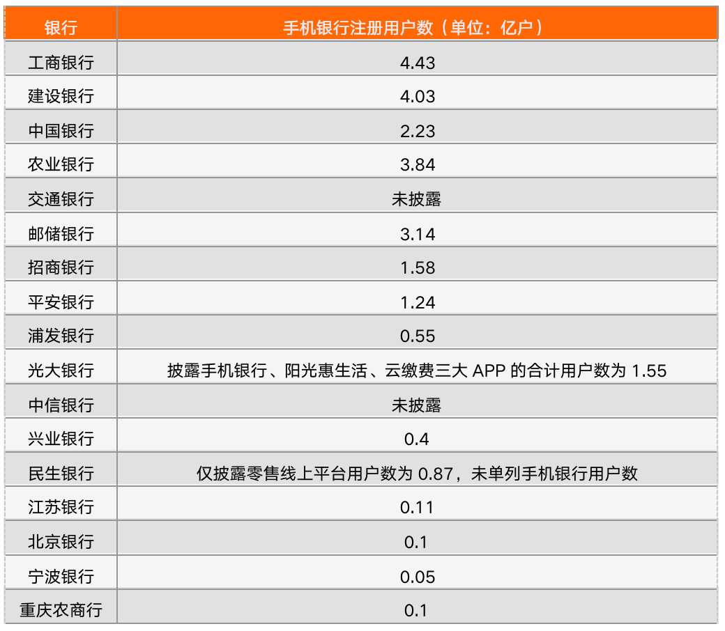2、4家銀行存在數(shù)據(jù)未披露或未單獨披露手機銀行數(shù)據(jù),包括交通銀行、光大銀行、中信銀行以及民生銀行。