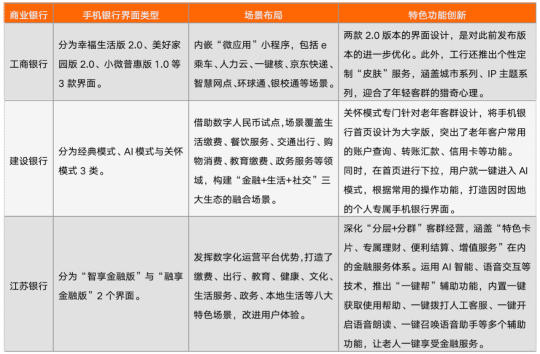 鑒于此,手機銀行必須做出差異化特色。近期,App適老化變革成為熱點,各家銀行先后推出針對細分人群的多個專屬界面,包括適老化版本。從下述工商銀行、建設(shè)銀行以及江蘇銀行的最新做法,可以看出在場景融入與功能創(chuàng)新方面的探索實踐: