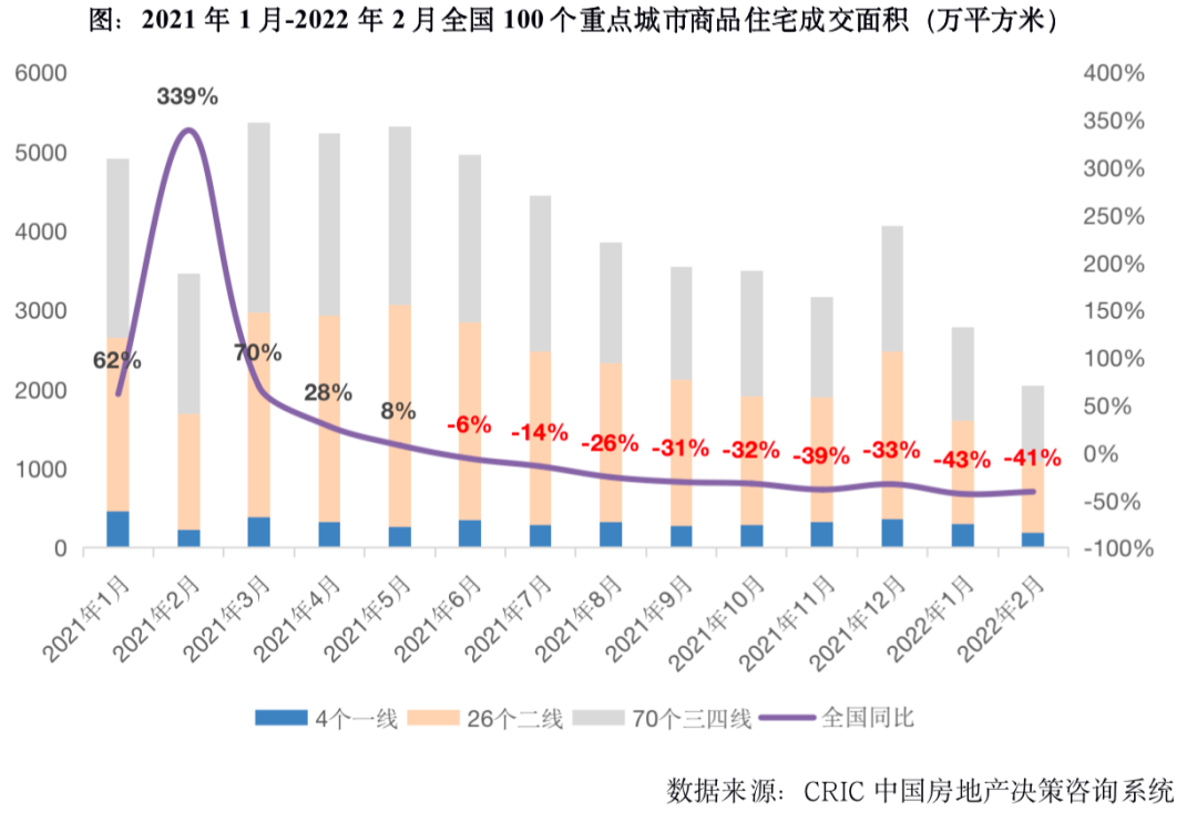 2021年下半年以來,房地產市場步入快速下行通道,樓市持續轉冷,百城成交量持續縮水,同比跌幅逐漸擴大,2022年2月,全國100個重點城市商品住宅成交面積僅為2043萬平方米,創近兩年來單月新低,同比跌幅達到41%,三四線城市領跌,跌幅達46%。