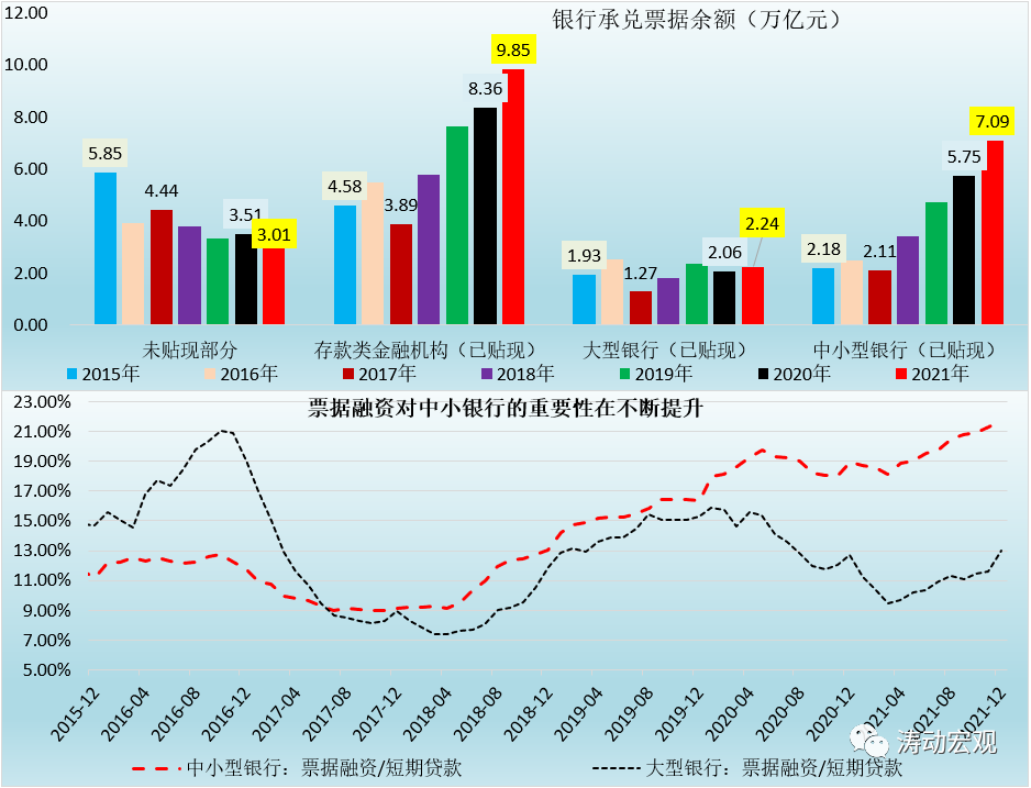 對于銀行承兌匯票數據的觀察可以從兩個指標來看,即社融指標的未貼現銀票和已貼現銀票,前者被視為表外融資部分(通過每月公布的社融指標來確定),后者則通常被視為銀行的表內業務(通過金融機構信貸收支表來確定)。具體看,截至2021年12月底,未貼現銀行承兌匯票余額達到3.01萬億,金融機構提供的票據貼現融資余額為9.85萬億(本外幣口徑)。其中,大型銀行和中小型銀行的余額分別為2.24萬億和7.09萬億。