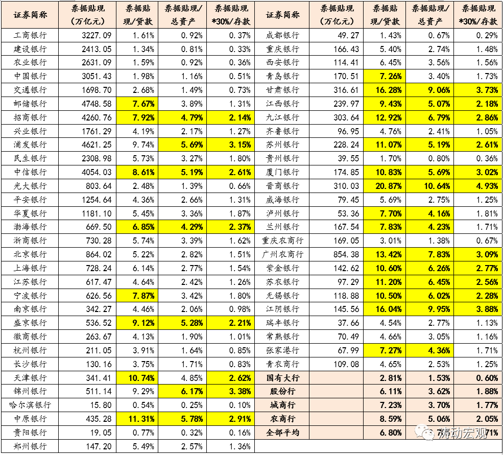 3、部分銀行的票據貼現余額占比明顯偏高,如23家上市銀行的票據貼現余額占其貸款的比例超過7%(56家上市銀行的平均水平為6.80%)、21家上市銀行的票據貼現余額占其總資產的比例超過4%(56家上市銀行的平均水平為3.70%)、19家上市銀行的票據保證金(按貼現余額的30%計算)占其存款的比例超過2%(56家上市銀行的平均水平為1.71%)。