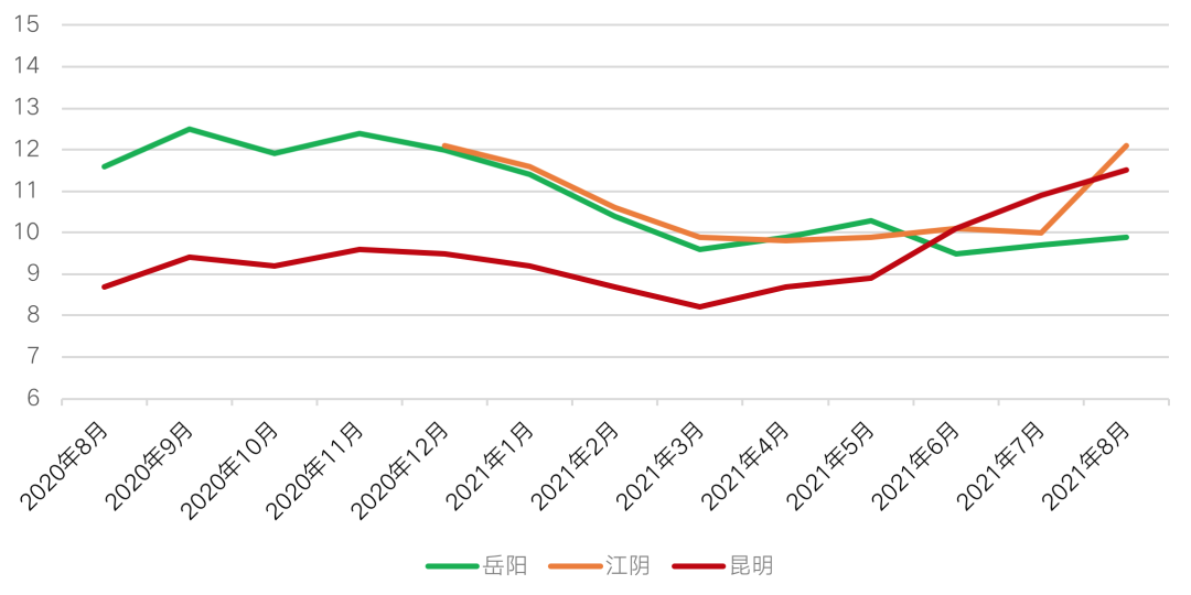 圖:2020年8月以來(lái)岳陽(yáng)、江陰、昆明去化周期走勢(shì)(單位:月)