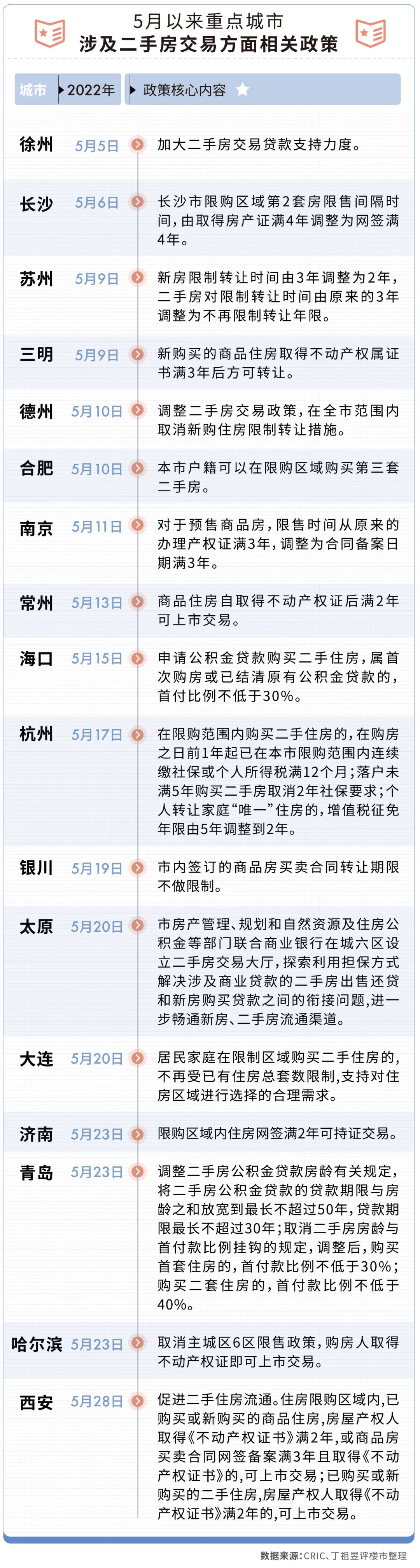 比如縮短限售年限,西安、哈爾濱、南京、蘇州等10個城市放松限售,其中蘇州更是不再限制二手房轉讓年限;南京在調整了限售年限后,又在5月20日全面取消二手房限購,由于觸碰政策底線,于當日被緊急叫停。