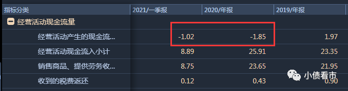 除此之外,大業股份的經營獲現能力也在惡化,2020年和今年一季度其經營性現金流凈額分別為-1.85億和-1.02億元。