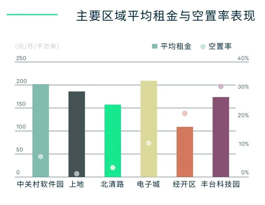 中關(guān)村軟件園子市場受沖擊較大,錄得負(fù)的凈吸納量;而北清路子市場則憑借租金成本優(yōu)勢,空置率持續(xù)下行;上地、東升租賃活躍度保持平穩(wěn)。