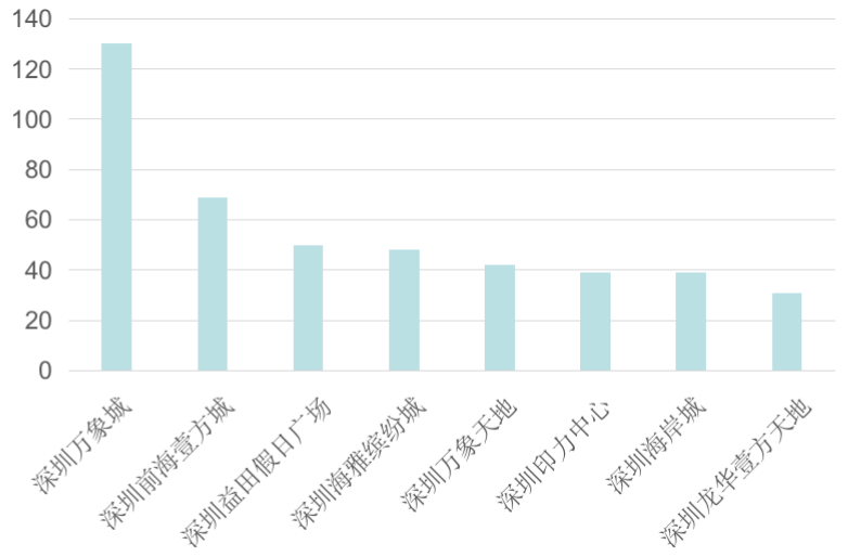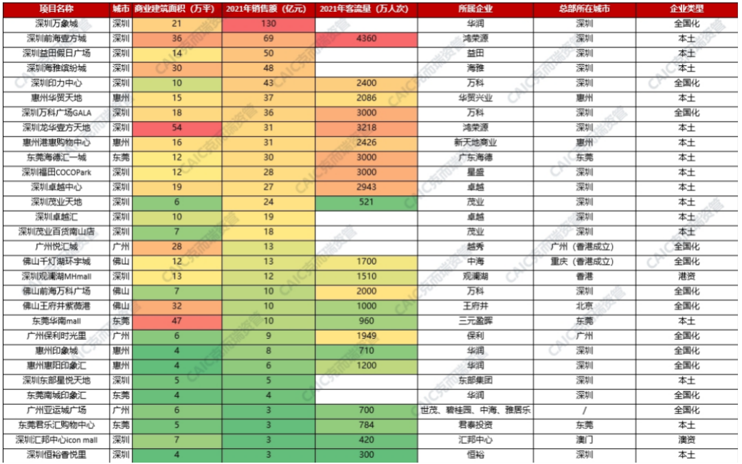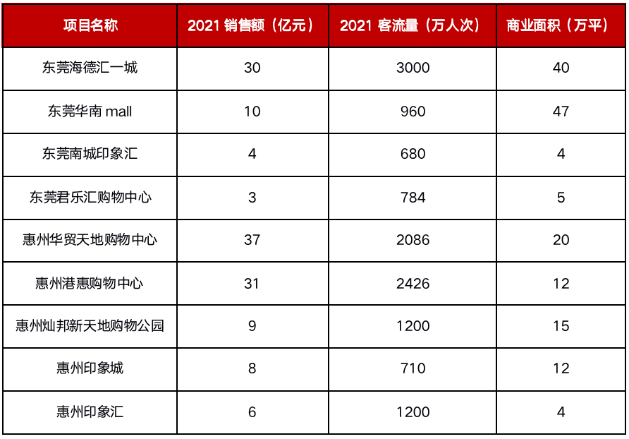 東莞惠州標(biāo)桿級項目則較少。2021銷售額百強項目排名中,惠州華貿(mào)天地購物中心以36.5億銷售額位列第52位,惠州港惠購物中心以31億銷售額位列第58位,東莞海德匯一城以30億銷售額位列第71位。