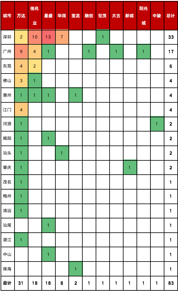 從企業(yè)項目分布來看,萬達(dá)布局?jǐn)?shù)量最多,范圍最廣;佳兆業(yè)、星盛擁有本土優(yōu)勢,在廣深形成“寡頭”效應(yīng);華潤高度聚焦深圳,其他企業(yè)布局則較為分散。