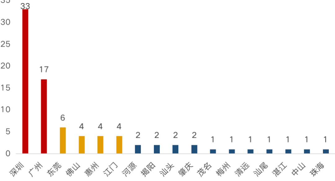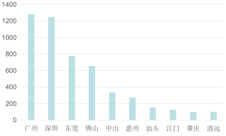 其中深圳數(shù)量遙遙領(lǐng)先,廣州位于其后;東莞、佛山、惠州、江門處于第二梯隊,其他城市關(guān)注度較低。整體來看熱度集中,深度下沉不夠,廣深“能進(jìn)則進(jìn)”,都市圈城市擇機進(jìn)駐,其他城市“能不進(jìn)就不進(jìn)”。