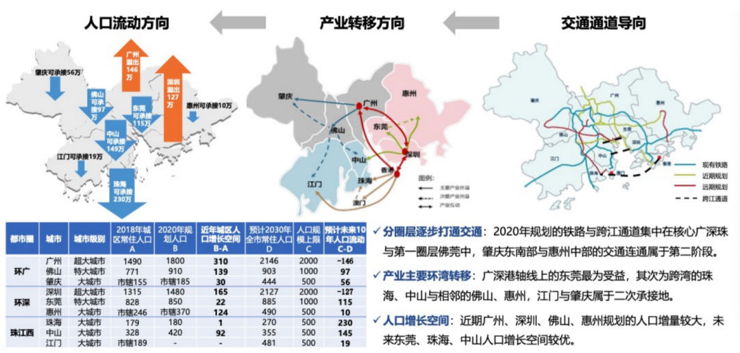 從人口流動、產(chǎn)業(yè)轉(zhuǎn)移、交通建設(shè)三個方面,珠三角城市圈內(nèi)形成了“廣佛肇”、“深莞惠”、“珠中江”三個小群落。