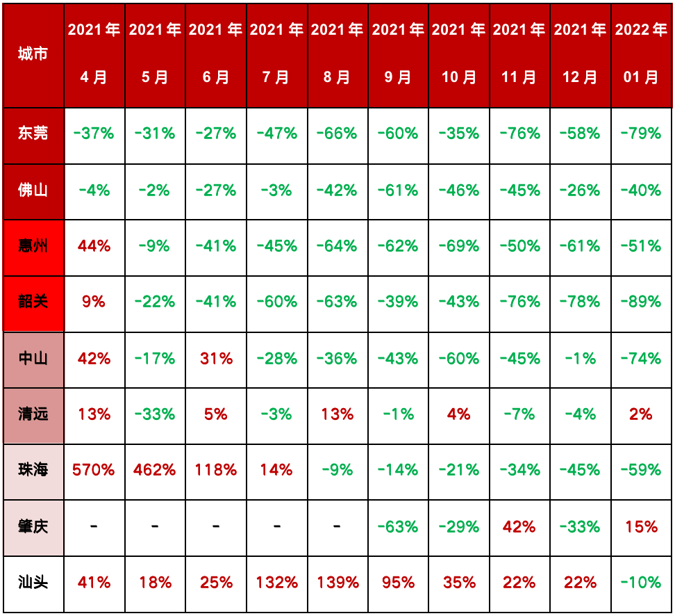 從2021年4月-2022年1月珠三角主要城市住宅銷售面積同比情況看,市場快速向外圍低能級城市傳導(dǎo)。