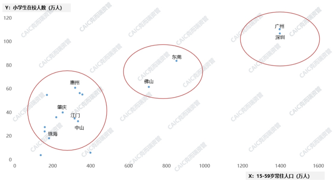 從人口基數(shù)來看,深圳為人口流入最多的廣東城市;廣州常住人口最多,同時也有穩(wěn)定的人口流入;東莞佛山依然位于第二梯隊,遠(yuǎn)超其他三四線城市;肇慶整體人口流失。從人口結(jié)構(gòu)來看,廣深小學(xué)生人數(shù)最多,消費“流量”穩(wěn)定,且青年人口居多,消費活力充足;東莞佛山次之,其他城市較弱,整體人口格局未變。