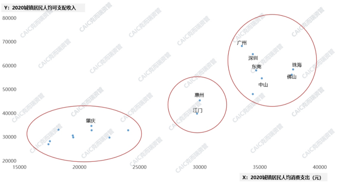廣州、深圳、東莞等城市組團的人均可支配收入、人均消費支出也很高,屬于“有錢肯花”的城市,消費旺盛,商業(yè)發(fā)展?jié)摿ψ恪6貞c等低能級城市消費水平則顯著較弱決定了在這些城市做商業(yè)的風(fēng)險和天花板。