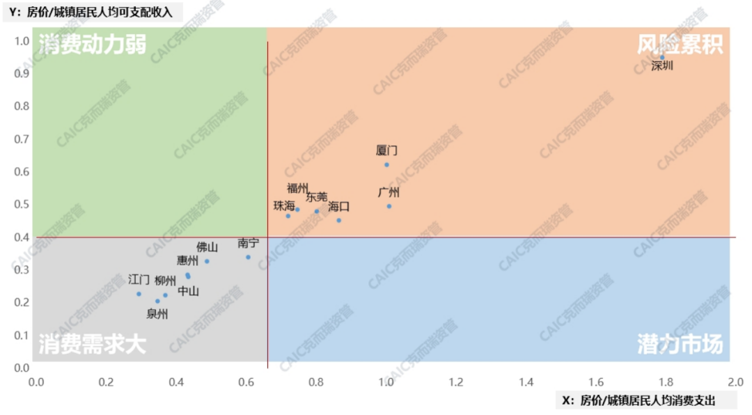 房價占人均可支配收入越高,房價與人均消費支出占比越高,意味著房產(chǎn)消費對商業(yè)消費產(chǎn)生了抑制作用。對珠三角及周邊城市數(shù)據(jù)分析來看,對于商業(yè)地產(chǎn)投資來說,深圳等高能級城市房價對消費抑制的風(fēng)險正在累積,而低能級的消費需求仍需要進(jìn)一步釋放。