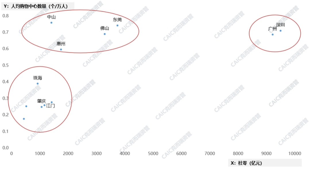 從城市人均購物中心數(shù)量和社零的對比來看,廣州、深圳社零基本面較好,城市整體商業(yè)面積仍未滿足人口消費需求,天花板較高,商業(yè)仍有發(fā)展空間。而中山、惠州、佛山、東莞市場飽和已顯現(xiàn),珠海、肇慶、江門仍處于購物中心稀缺階段。