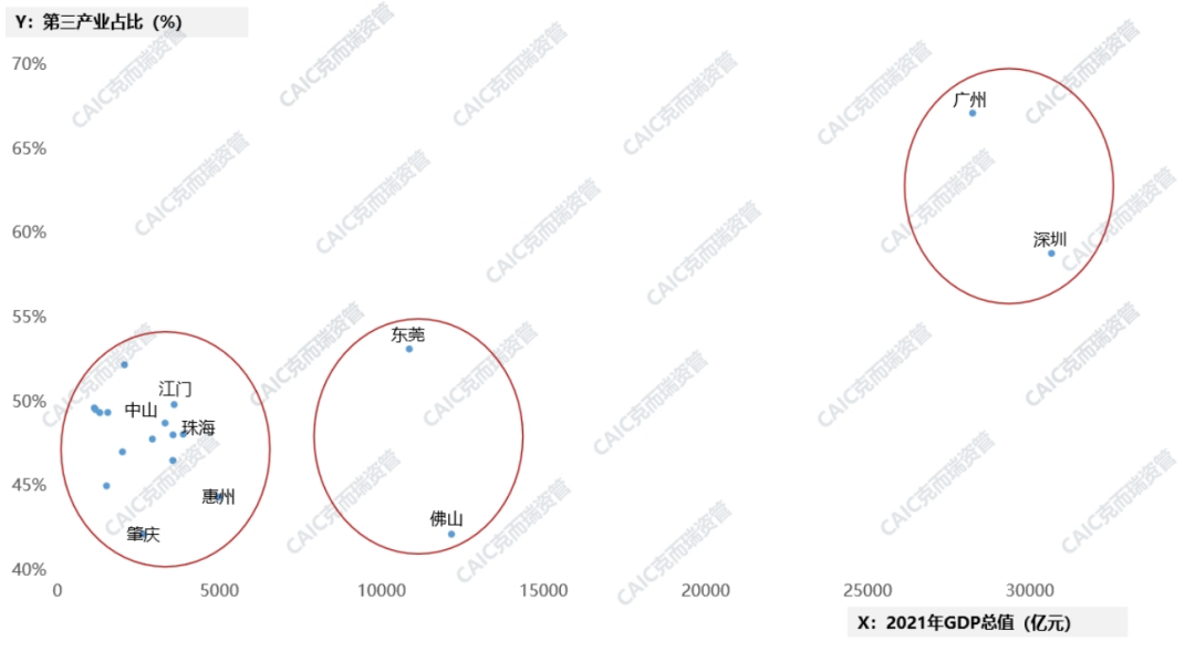 2022年,廣東省“一核一帶一區(qū)”區(qū)域發(fā)展新格局基本確立,其中由韶關(guān)、梅州、清遠(yuǎn)、河源、云浮組成的北部生態(tài)發(fā)展區(qū)將嚴(yán)格控制開發(fā)強度,著力發(fā)展現(xiàn)代農(nóng)業(yè)、休閑旅游、綠色低碳產(chǎn)業(yè),承接發(fā)展引擎區(qū)產(chǎn)業(yè)轉(zhuǎn)移的可能性較小。我們關(guān)注的九個城市雖然定位為廣東省的發(fā)展引擎,但廣深仍遠(yuǎn)超其他城市,莞佛位于第二梯隊,其他城市均無突出表現(xiàn),身為“引擎”,未來產(chǎn)業(yè)發(fā)展仍需提速。