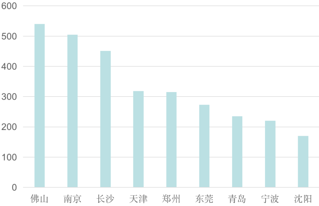 從項目分布上看,珠三角城市商業(yè)項目高度集中于廣深,東莞、佛山處于第二梯隊。佛山:2020年佛山新開業(yè)項目體量排全國第三,在華南僅次于廣州,2021年佛山新開購物中心39家,領(lǐng)跑廣東,新增供應(yīng)252.1萬㎡,延續(xù)市場競爭白熱化狀態(tài)。