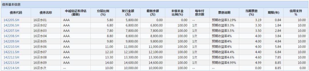 另一種是“優(yōu)先級分檔”模式,即對優(yōu)先級證券按照到期日拆分成多檔,如“云南水務(wù)水費收費權(quán)資產(chǎn)支持專項計劃”。據(jù)筆者統(tǒng)計,該分層模式占比遠遠大于“大優(yōu)先級”模式。