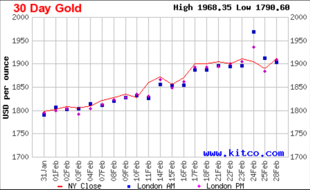 近期受到俄烏沖突影響,2周內(nèi),金價(jià)自1850美元沖高到1974美元高點(diǎn)。