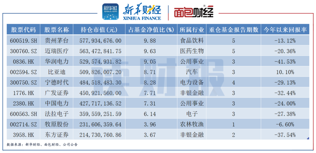 具體持倉來看,該基金重點配置了A股和港股中食品飲料、新能源、醫(yī)療、金融、電力運營等方向的頭部標(biāo)的,其中貴州茅臺、邁瑞醫(yī)療兩只股票從成立以來一直持有,當(dāng)前持倉比例均接近基金資產(chǎn)凈值的10%。