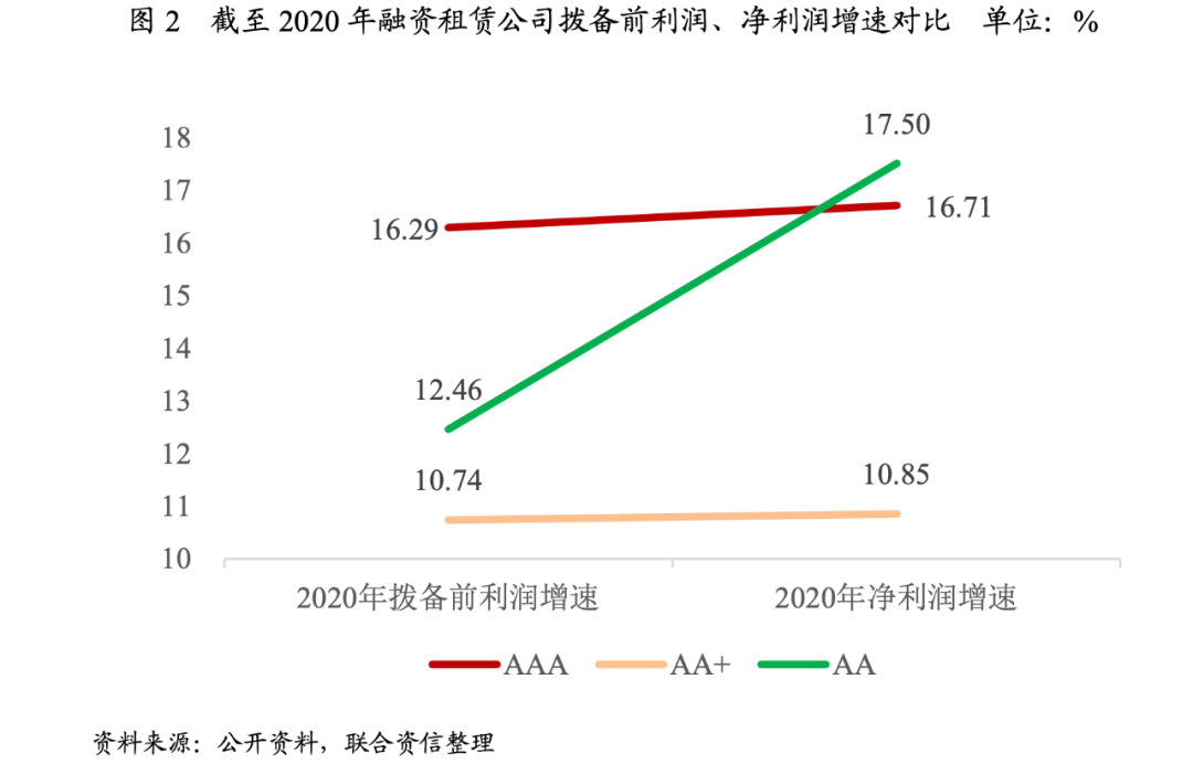 從利潤規(guī)模來看,2020年,AAA、AA+和AA級(jí)別融資租賃公司的平均撥備前利潤同比增長16.29%、10.74%和12.46%。2020年,AAA、AA+和AA級(jí)別融資租賃公司的平均凈利潤同比增長16.71%、10.85%和17.50%,AA級(jí)別融資租賃公司平均凈利潤增速最快,增速超過AAA級(jí)別融資租賃公司,其中AA級(jí)別融資租賃公司計(jì)提的減值準(zhǔn)備比例較低是原因之一。2021年上半年,AAA、AA+和AA級(jí)別融資租賃公司的平均凈利潤同比增長28.51%、33.08%和4.14%,各級(jí)別融資租賃公司凈利潤均實(shí)現(xiàn)增長,但是增速分化明顯。