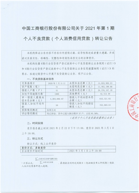 2月8日,平安銀行和工商銀行分別在銀登網上發(fā)布了其首個個人不良貸款轉讓公告。兩家銀行不約而同的選在了3月1日采用多輪競價的方式進行競價轉讓,并按《信息披露細則》的規(guī)定和附件1《不良貸款轉讓公告》模板,在公告中披露了不良貸款基本信息。