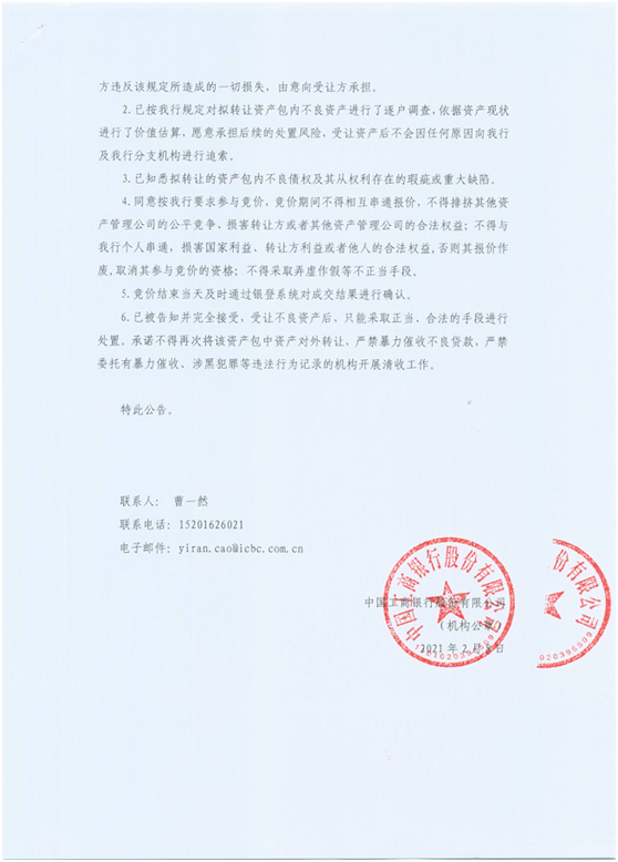 工商銀行第3期轉讓的標的亦為信用卡透支類不良貸款,共31戶(32筆),均未訴訟,逾期天數(按未嘗本息總額加權平均)168天。未嘗本金總額約2825萬元,未嘗利息總額約277萬元,未嘗本息總額約3102萬元,競價起始價0元,加價幅度10萬元。