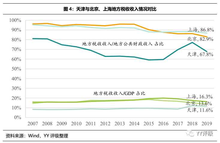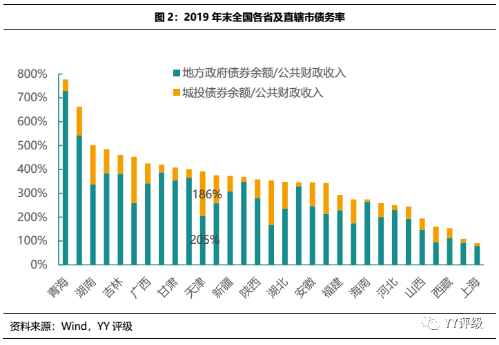 基建開(kāi)發(fā)如火如荼帶來(lái)債務(wù)規(guī)模的擴(kuò)張,2019年末天津市地方政府債券余額為9,433億元,此為顯性債務(wù);區(qū)域內(nèi)城投債券余額為4,486億元,此為隱性債務(wù)的一部分。此前,YY團(tuán)隊(duì)曾分別采用負(fù)債端和資產(chǎn)端資金來(lái)源兩種方法對(duì)省級(jí)單位的隱性債務(wù)進(jìn)行了測(cè)算,負(fù)債端測(cè)算得到天津2018年末隱性債務(wù)余額為1.878萬(wàn)億元,資產(chǎn)端測(cè)算得到1.702萬(wàn)億元。以債務(wù)率指標(biāo)對(duì)全國(guó)31個(gè)省級(jí)單位進(jìn)行橫向?qū)Ρ龋旖虻膮^(qū)域債務(wù)總額/公共財(cái)政收入比率為391%,相對(duì)債務(wù)壓力排名靠前。