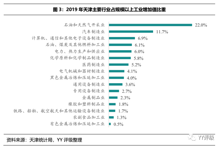 天津是老牌工業(yè)城市,而工業(yè)產(chǎn)值中的絕大部分比重來(lái)自于重工業(yè)。在2019年規(guī)模以上工業(yè)增加值中,石化、鋼鐵、冶金等重工業(yè)占比仍然較高。