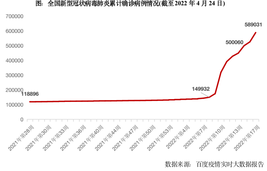 2月下旬以來,全國新冠確診病例數(shù)呈快速攀升走勢(shì),累計(jì)確診病例數(shù)突破50萬。截至4月24日,全國(含港澳臺(tái))報(bào)告累計(jì)新型冠狀病毒肺炎確診病例58.9萬例,較一周前增加6.3萬例,較2022年初增加45萬例,累計(jì)死亡病例14881例,較年初增加近1萬例。